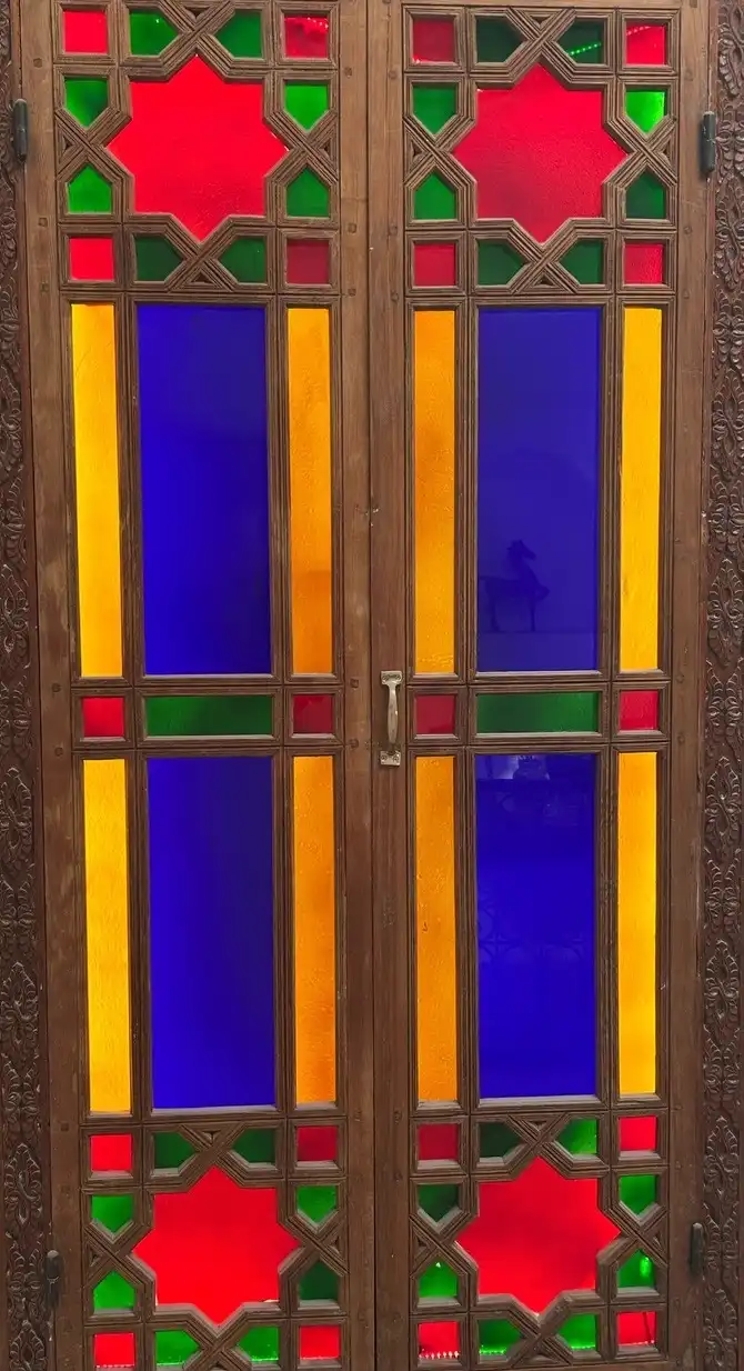 When we arrived, the ancient woodwork of the house was unrecognizable. After several months of restoration, the windows, doors, mashrabiya, and half-moons have regained their former glory, adorned with hand-painted Iraqi glass.