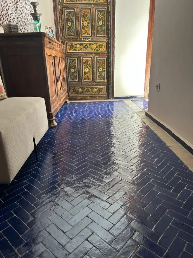 Our riad is distinguished by a magnificent multicolored zellige fountain, created by a master Fassi artisan. Built entirely by hand, it is a unique and remarkable piece that enhances our entrance with its traditional motifs and vibrant colors.
