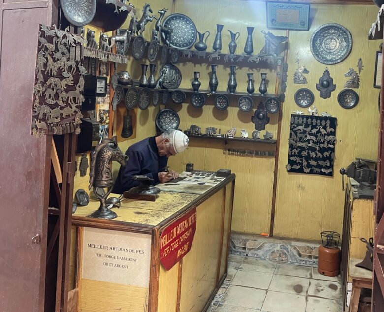 Just a stone’s throw from Najjarine Square lies the last Damascening workshop in Fez… The Maalem (Master Artisan) in the photo is already very old, …